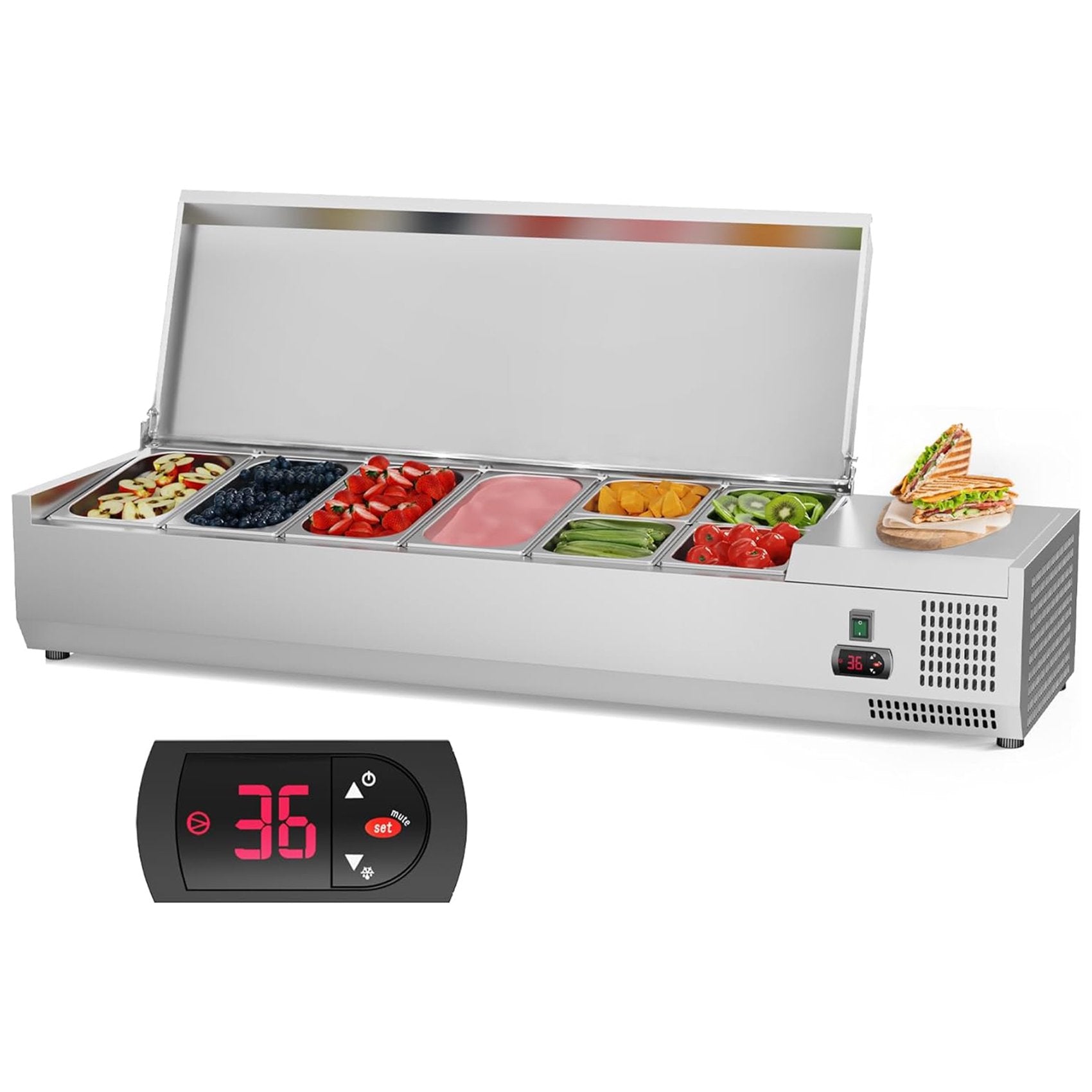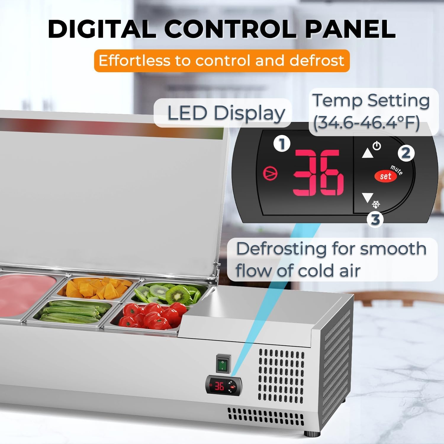 This countertop condiment prep station features a digital temperature control with an external LED panel, allowing you to monitor the interior temperature at a glance. You can set the temperature between 34.6°F and 46.4°F. It also includes a one-click defrost function to ensure smooth cold air circulation inside the unit, keeping your ingredients evenly cooled and fresh.